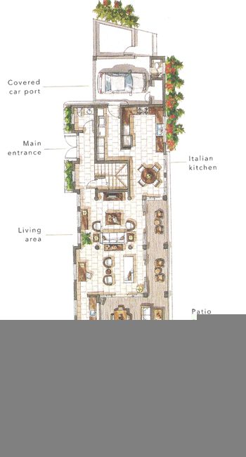 • To centre of demising wall, outside of walls and inclusive of covered space but not area covered space but not area covered by trellis. The stair has only been counted once with half the area applied to each level