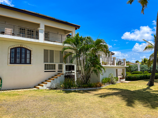 This unique Spanish style 6 bedroom 4 bathroom multi-level beachfront villa has plenty to offer. Located in the well-known neighborhood of Atlantic Shores, the house backs onto the popular βSouth Pointβ surfing spot. The main home entry is via a sunny courtyard. The front door opens onto a plant-filled reception area. The large well-equipped and renovated kitchen is to the left and includes a granite island, plenty of cupboards and stainless-steel appliances. Next to the kitchen is a small patio perfect for having your morning coffee. In front of the kitchen is the large family room with excellent sea views. The dining area is at the side, and opens onto a sunny terrace overlooking the garden.