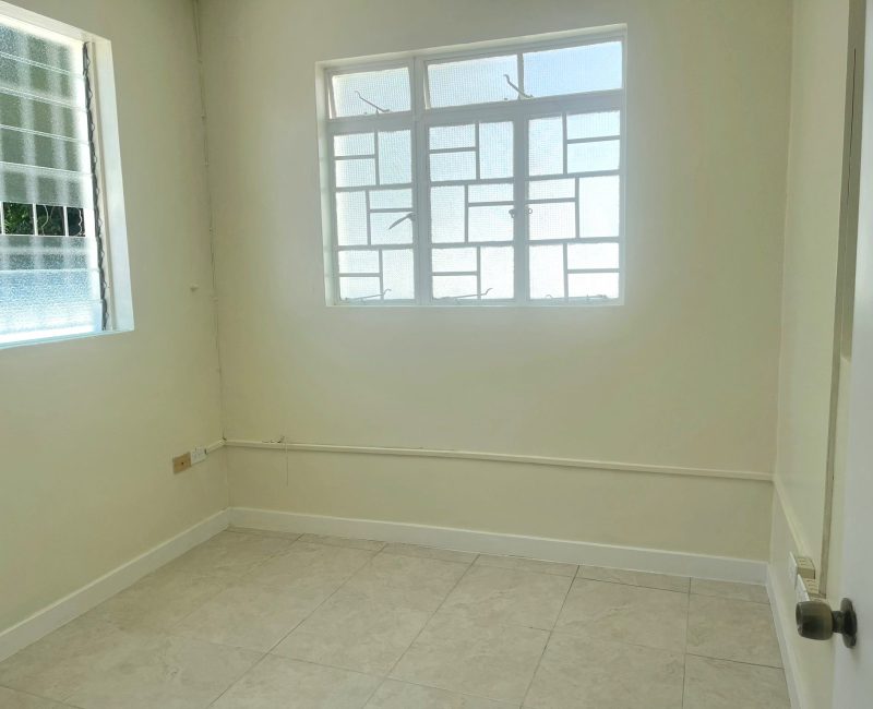 The second space on the eastern side is entered through a separate doorway into a space that can be used as a waiting room and reception area. Stepping into the corridor area, you face two offices, two bathrooms, and a small counter area. This area is approximately 700 square feet: BDS$$3000.00/month plus VAT.