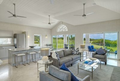 Through a sunlit white hallway, three en-suite, air-conditioned bedrooms each open onto a shared back patio overlooking the manicured lawns and ninth fairway of the famous Sandy Lane βOld Nineβ golf course. Also situated on the ground floor is an air-conditioned impeccably furnished study and gym, both of which could be converted to additional bedrooms if desired.