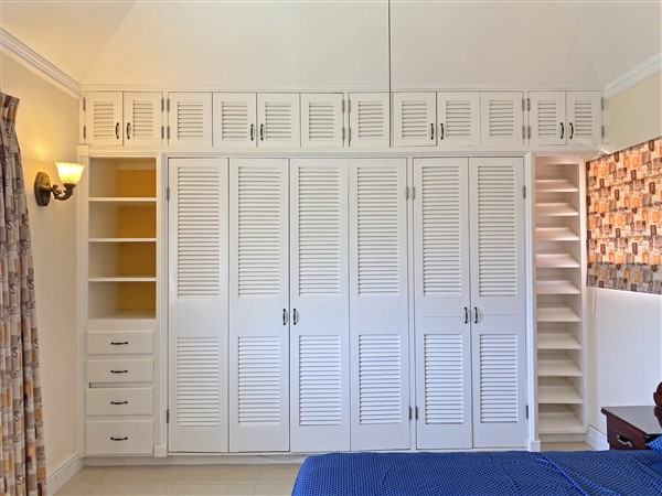 Returning to the main dining area, there is a grand spiral staircase leading to the second level of the home. Just off the landing is a North facing private deck, with dual access from the upstairs office space. The two bedrooms in the first wing share a bathroom, while the master suite is in a wing of its own, complete with an expansive walk-in closet, as well as a private, ocean-facing balcony. The ensuite bathroom is reminiscent of those within the Crane Resort, offering grand finishes, including colonial-style pillars, and all the luxuries of a double vanity, tub, bidet, and enclosed shower. All 3 of the upstairs bedrooms are spacious and outfitted with well-designed built-ins.