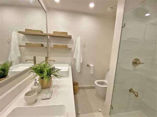 The master bedroom is equipped with a king sized bed and ensuite bath with a double vanity and access to the balcony via another set of glass doors. The second bedroom has two twin beds and there is second bathroom located in the hallway with a combined shower and tub for added convenience.