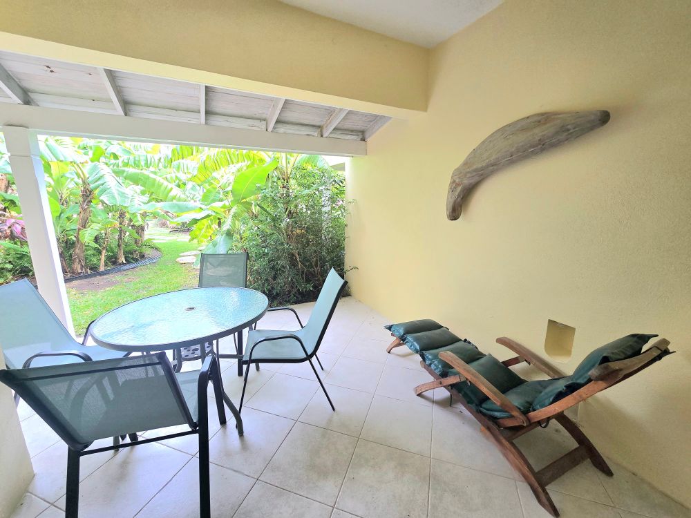 open-plan layout, fully equipped kitchen, and a private patio just steps from
