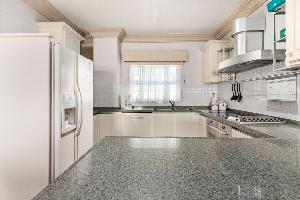 This apartment is furnished to an excellent standard. The master bedroom has two single beds as does the second bedroom, these can be made into king beds on request. Both bedrooms are air conditioned and have ceiling fans. There is a large patio looking over the pool, garden and beach. There is a fully equipped open plan Italian kitchen.