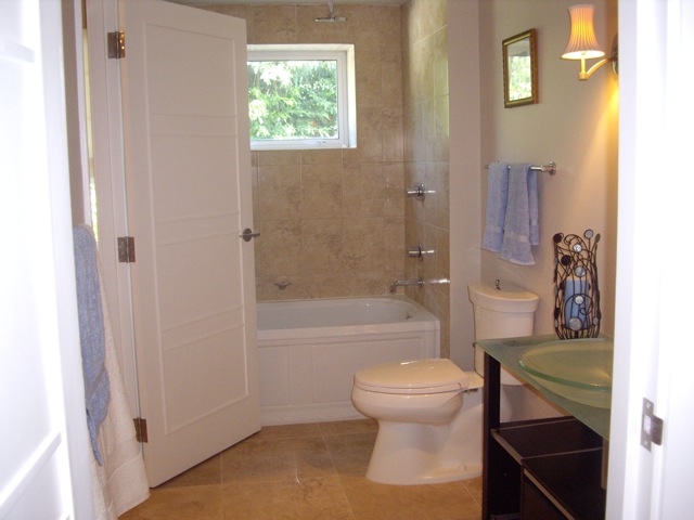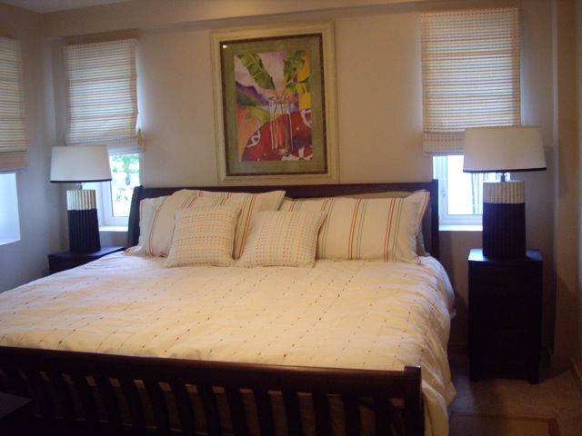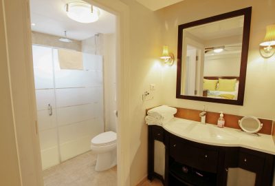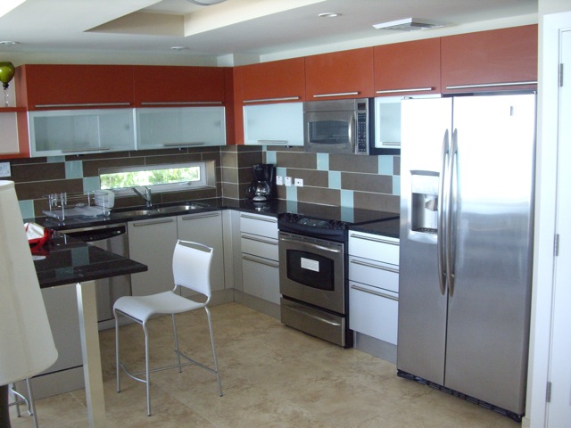 With just under 1800 square feet of exquisite floor space the three bedroom apartments offer ample space for larger groups and families featuring two en-suite bathrooms with rain-style showerheads and also a full guest bathroom. Each room has built-in closet space and all are tastefully furnished. The kitchens feature a large kitchen island that acts as a breakfast bar and houses the electric stove and stove top. The living areas are huge and as with the two bedroom apartments, feature large glass doors that open out to the generous ocean view balconies.