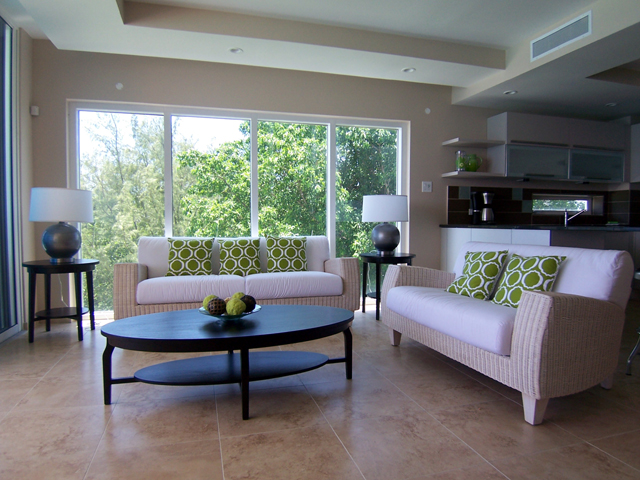 Each room is equipped with individual air-conditioning and most with ceiling fans. All units feature an open designed living / dining area which looks out onto the ample balcony with gorgeous ocean views. These areas too are fully air-conditioned, but offer you the choice of opening the large glass balcony doors to be cooled by the sea breezes. The two bedroom apartments