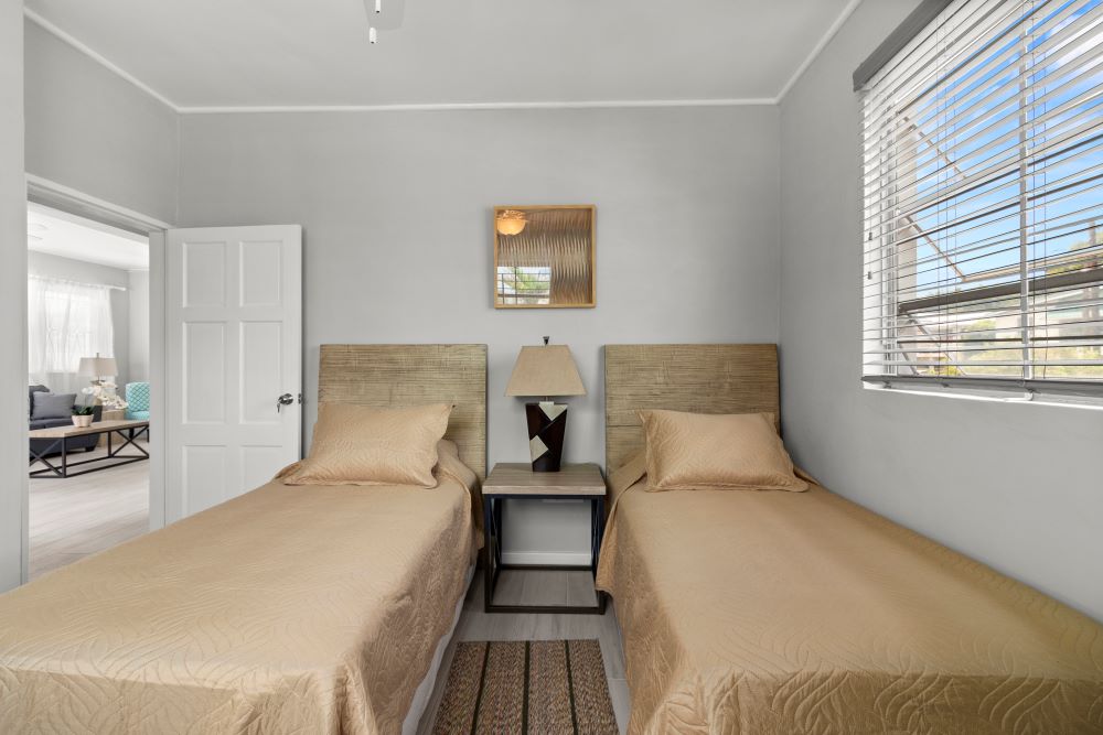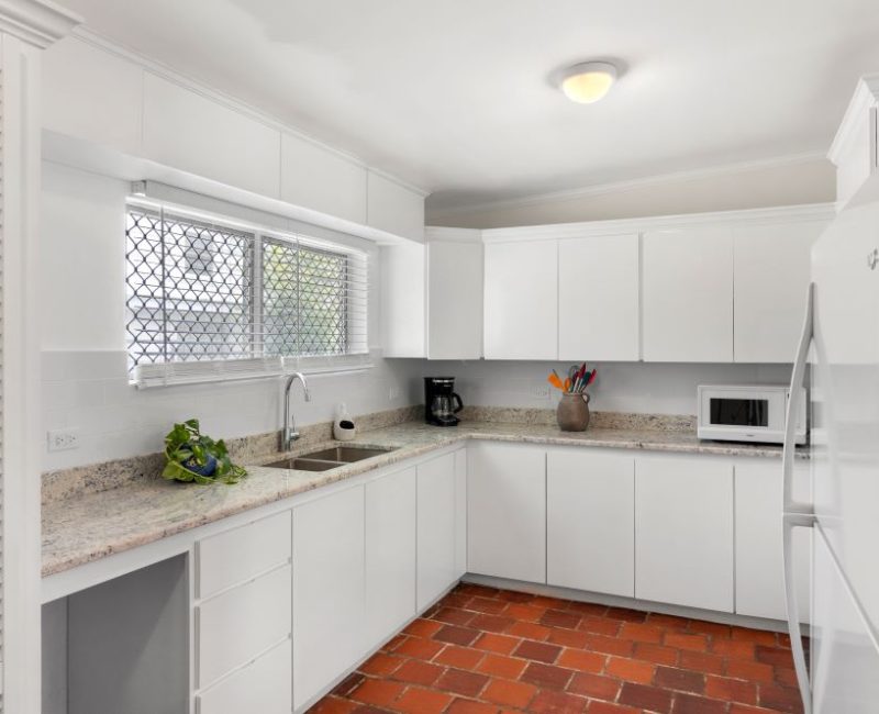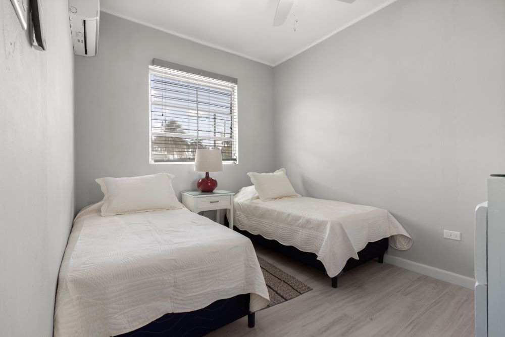 Modern finishes and cool colours make this fully furnished home a comfortable place to reside. The property is fully fenced and allows for off-street parking of two cars. The Master bedroom has a large en-suite bathroom with double vanity and shower. The guest bathroom is located in the hallway between the Master Bedroom and one of the guest bedrooms. All bedrooms are air-conditioned. The modern kitchen is spacious and has granite countertops throughout, large pull-out drawers for pots and pans, a dishwasher, an enclosed closet for the clothes washer and dryer and a large pantry cupboard. Crockery, cutlery and linen are included.