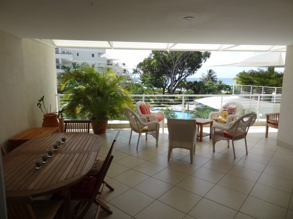 The beautiful condominiums at Palm Beach, offer a very unique experience by combining sophisticated elegance and design in the heart of the south coast with a vast array of amenities. Located on over 4 acres of prime beachfront property, it offers a lovely beach, large swimming pools and a fitness centre in a gated community offering 24/7 security. This particular unit is a beautifully furnished second floor unit comprising of 3 bedrooms and 3.5 bathrooms with ceiling fans throughout and a/c in all the bedrooms. A very open and spacious kitchen complete with granite countertops, stainless steel appliances and some bar stools opens out to a huge, open plan living area that is almost 20 x 20 with a large flat screen t.v.. This extends outside to a massive and breezy sheltered patio that overlooks the swimming pools while offering views of the sea. This also leads separately in to the master bedroom that is about 20 x 16 with a king sized bed, walk-in closet, and an en suite bathroom with a shower, tub and double vanity. The other two bedrooms are approximately 14 x 12 and 12 x 11 respectively, with each bedroom