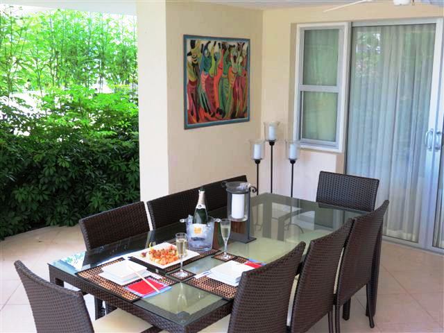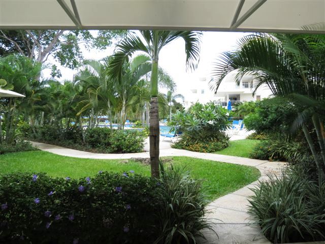 This condo is well outfitted with a comfortable open plan kitchen/living area offering a well equipped kitchen with casual seating at the granite countertop while the beautifully furnished lounge area is spacious and leads out to the covered patio which offers outdoor dining and lounge chairs for relaxing while looking out to the beautiful tropical garden with the pool just a few steps away. From the pool a pathway leads you down to a small gate leading directly out to